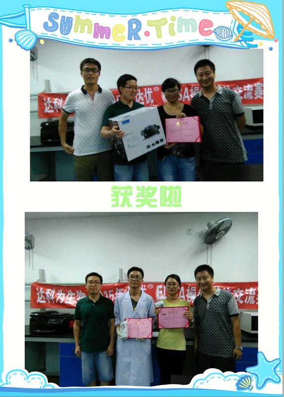 上午9點半正式開始,先是由相關(guān)人員講解比賽的注意事項及評分標(biāo)準(zhǔn),然后參賽人員開始正常操作比賽。這次參賽的人員有來自彭濤課題組、黃俊課題組的學(xué)生以及研究所的技術(shù)人員。此次參賽的大部分人員由于都有一定的ELISA實驗基礎(chǔ),因此比賽的流程進行地比較順暢,其中有一位同學(xué)接下來的課題剛好需要用到ELISA檢測,他說通過這次的交流賽,也是為接下來的實驗?zāi)M操作,能夠幫助自己發(fā)現(xiàn)實驗操作中的不足和漏洞,收獲頗豐。并且還說今后購買試劑盒會優(yōu)先考慮我們達優(yōu)?試劑盒的。免疫所的老師不僅幫我們監(jiān)督評分還幫我們頒獎,還介紹說這次所里的有些學(xué)生暑假回家了,人數(shù)比較少,不然這是一個很好的交流機會,同時也希望我們以后還有更多這樣的實驗技能交流賽。