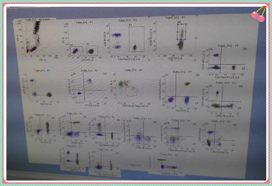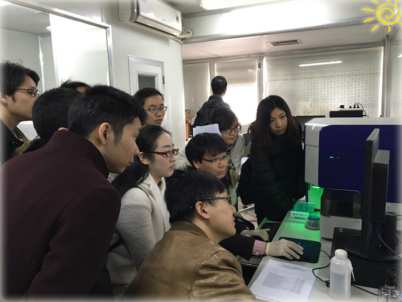最后為流式儀器檢測,由流式儀器平臺陳老師為上機學(xué)員講解上機測試過程以及數(shù)據(jù)分析。陳老師耐心細(xì)致的講解,從儀器的初始設(shè)置到電壓補償?shù)恼{(diào)節(jié),從同型對照及陰性陽性界限的設(shè)置,FMO的劃門設(shè)置到最終的數(shù)據(jù)分析,深入淺出,循循善誘,學(xué)員們都紛紛表示收獲頗豐。