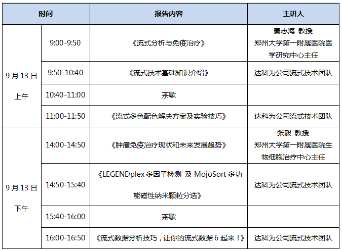 金秋九月,達(dá)科為流式培訓(xùn)班要來(lái)鄭州啦,名師講解,理論與實(shí)驗(yàn)雙管齊下,輕松完成流式八色檢測(cè)分析,更有LEGENDplexTM多因子Demo演示,磁珠分選Demo以及De Novo 流式軟件數(shù)據(jù)分析演示。流式上機(jī)名額有限,歡迎踴躍報(bào)名!理論培訓(xùn)和實(shí)驗(yàn)操作均免費(fèi)喲!
