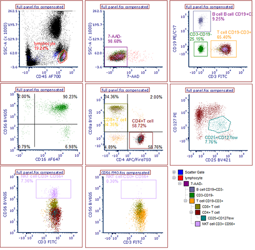 這次上機(jī)課程分為3個(gè)部分:T/B/NK/NKT/Treg10色檢測(cè);Th1/Th2檢測(cè);LEGENDplex多因子DEMO實(shí)驗(yàn)。上機(jī)課程中達(dá)科為技術(shù)團(tuán)隊(duì)為大家詳細(xì)介紹本次實(shí)驗(yàn)的相關(guān)內(nèi)容,包括: marker選擇、panel設(shè)置、對(duì)照選擇/設(shè)置,protocol染色操作及注意事項(xiàng)。關(guān)于操作部分,表染及胞內(nèi)染色的 DEMO實(shí)驗(yàn)之后詳細(xì)演示了儀器電壓補(bǔ)償?shù)恼{(diào)節(jié),同型對(duì)照及FMO對(duì)照的應(yīng)用等。