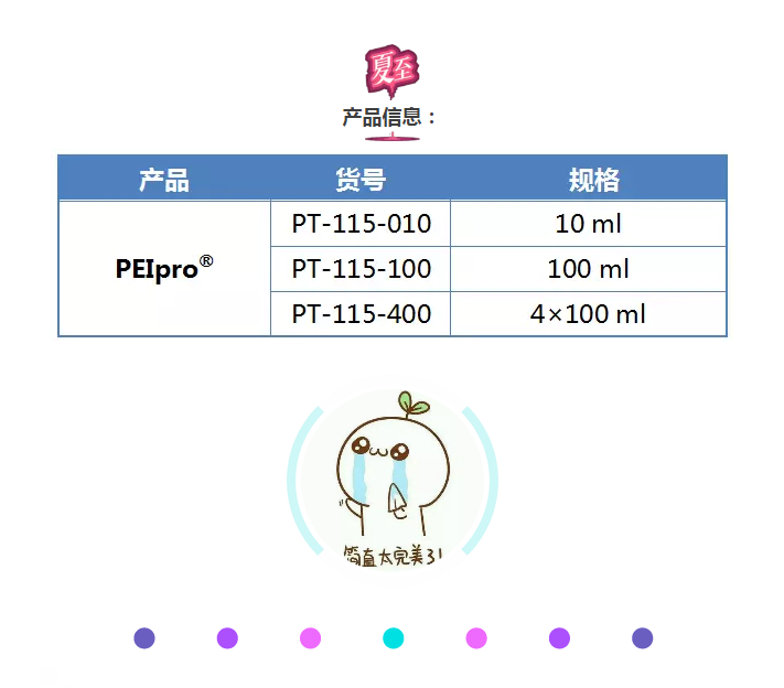法國Polyplus推出科研級PEIpro?和臨床級PEIpro?-HQ,基于PEI的高品質(zhì)轉(zhuǎn)染試劑,助力car-T技術(shù)研發(fā)和cGMP生物制品的生產(chǎn)應(yīng)用。