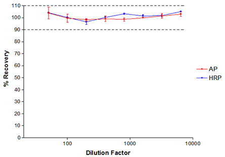 4. 步驟:在鏈酶親和素標(biāo)記CRP捕獲抗體和HRP/AP標(biāo)記CRP檢測抗體存在下,耗盡CRP的人血清加到250pg/ml CRP并連續(xù)稀釋后加到透明的96條板狀板中;