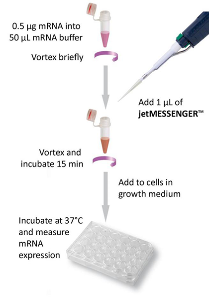 mRNA轉(zhuǎn)染是針對難轉(zhuǎn)染細胞如神經(jīng)元、原代細胞和懸浮細胞(淋巴細胞)的一種新的解決方法。這種轉(zhuǎn)染方法相較于DNA轉(zhuǎn)染有很多優(yōu)點:更高的轉(zhuǎn)染效率、轉(zhuǎn)染后更快速的蛋白表達以及較低的基因插入突變風(fēng)險。mRNA瞬時轉(zhuǎn)染可用于很多用途,包括細胞重編輯,基因編輯(CRISPR/Cas9)及疫苗研發(fā)。Polyplus-transfection?公司研發(fā)了一款新型的mRNA轉(zhuǎn)染試劑jetMESSENGERTM,難轉(zhuǎn)染細胞現(xiàn)在很容易轉(zhuǎn)染!
