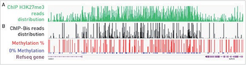 圖3 A: 使用Diagenode的iDeal ChIP-seq Kit對人細胞系Gm12878 H3K27me3標記的組蛋白進行染色質(zhì)免疫沉淀;B: 使用Premium WGBS Kit對ChIP’d DNA進一步處理并測序。