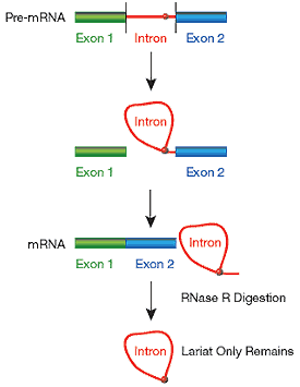 隨著環(huán)狀RNA的深入研究,環(huán)狀RNA制備問(wèn)題就越來(lái)越備受關(guān)注。Lucigen提供大腸桿菌來(lái)源的RNase R,是一種Mg依賴性的3’ →5’核糖核酸外切酶,能消化基本上所有線性RNA,但不消化套索或環(huán)狀RNA的結(jié)構(gòu),或者3’突出短于7個(gè)核苷酸的雙鏈RNA。即是除了tRNA,5S RNA和內(nèi)含子套索結(jié)構(gòu)外,大多數(shù)細(xì)胞RNA都將被RNase R完全消化。如圖4,RNase R可從總RNA中分離出內(nèi)含子前體mRNA剪切產(chǎn)生的套索RNA。以這種方法獲得的RNA作為模板來(lái)生產(chǎn)標(biāo)記的cDNA,可作為含有潛在的內(nèi)含子序列的微陣列的目標(biāo),或者用于包含完整的染色體或者基因組的重疊區(qū)域平鋪陣列。產(chǎn)生的cDNA不代表線性內(nèi)含子,但其含有的序列是來(lái)源于內(nèi)含子的。