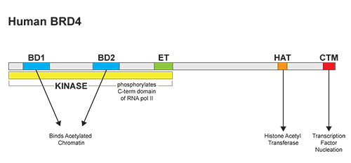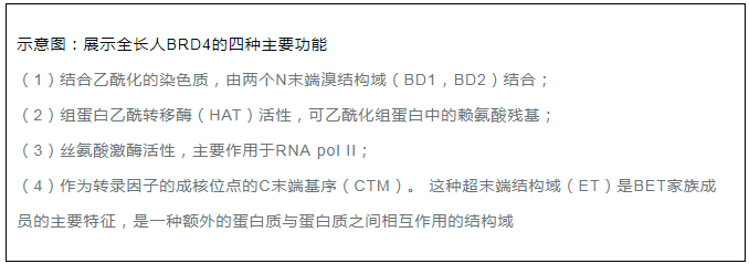 溴結(jié)構(gòu)域蛋白的BET家族的主要特征是它們都存在兩個溴結(jié)構(gòu)域和一種超末端(ET)結(jié)構(gòu)域2,6。其中,BRD4是研究較深入的。 BRD4具有四個主要的分子功能:(i)可以通過結(jié)合乙酰化組蛋白維持染色質(zhì)結(jié)構(gòu),這種活性是由它的N-末端結(jié)構(gòu)域中的位點調(diào)控的; (ii)可以通過其HAT催化結(jié)構(gòu)域發(fā)揮組蛋白乙酰轉(zhuǎn)移酶(HAT)活性2,6; (iii)絲氨酸激酶活性,主要作用于RNA pol II;(iv)C端結(jié)構(gòu)域,可以發(fā)揮轉(zhuǎn)錄因子和復(fù)合物的結(jié)合和成核位點。研究發(fā)現(xiàn),BRD4常出現(xiàn)在幾種轉(zhuǎn)錄復(fù)合物,包括常見的輔因子調(diào)控子和P-TEFb 延伸因子6。 其C端結(jié)構(gòu)域也可以調(diào)控BRD4與許多眾所周知的轉(zhuǎn)錄調(diào)節(jié)因子之間的相互作用,顯著的有:P-TEFb,MYC,NFκb 以及p532,4,6-8等。