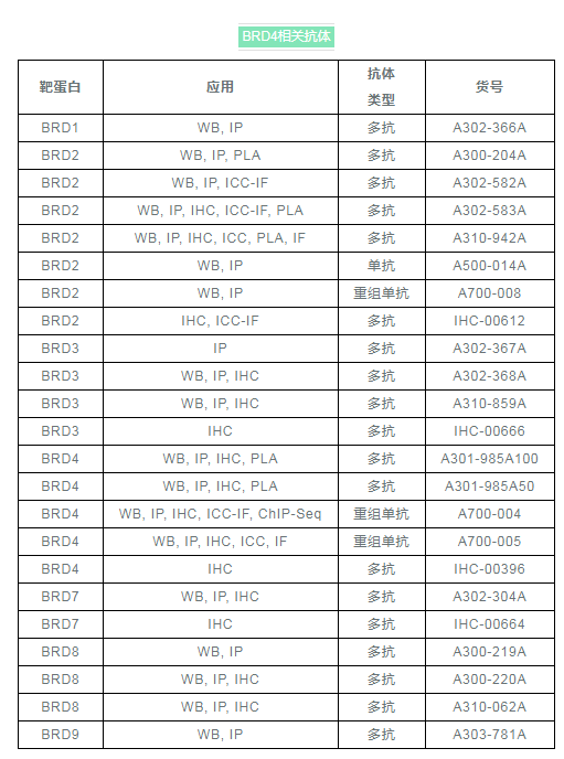 Bethyl認(rèn)識到BRD4在細(xì)胞周期調(diào)控和腫瘤發(fā)生中的重要性,研發(fā)了質(zhì)量優(yōu)秀的BRD4抗體,以及許多其他相關(guān)蛋白質(zhì)的抗體,以促進癌癥研究發(fā)展。
