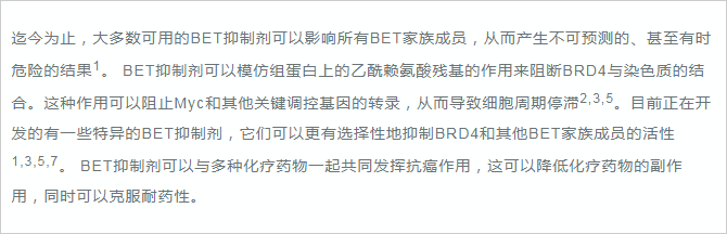 BRD4(溴結(jié)構(gòu)域蛋白4)是一種轉(zhuǎn)錄調(diào)節(jié)因子。研究發(fā)現(xiàn),BRD4在癌癥、自身免疫和炎癥性疾病中具有重要的作用1,2。 正常生理情況下,BRD4主要參與細(xì)胞周期過程中的基因表達調(diào)控,其可以與乙?;旧|(zhì)結(jié)合,保持各種基因在細(xì)胞分裂循環(huán)過程中的穩(wěn)定表達 ,這種現(xiàn)象被稱為表觀遺傳記憶或基因轉(zhuǎn)錄的“書簽”2,7。 同時,BRD4在調(diào)控分化和發(fā)育中也起著關(guān)鍵作用2,4。 如果BRD4缺失,骨髓干細(xì)胞將不能分化成為B和T細(xì)胞2。 BRD4亦是MEFs或B細(xì)胞重編程為誘導(dǎo)多能干細(xì)胞過程中重新表達干細(xì)胞基因所必需的,在成骨細(xì)胞分化過程中BRD4也發(fā)揮重要作用。 綜上,BRD4在細(xì)胞周期調(diào)控和分化中的重要作用使其成為癌癥和免疫系統(tǒng)疾病的新興治療靶點。