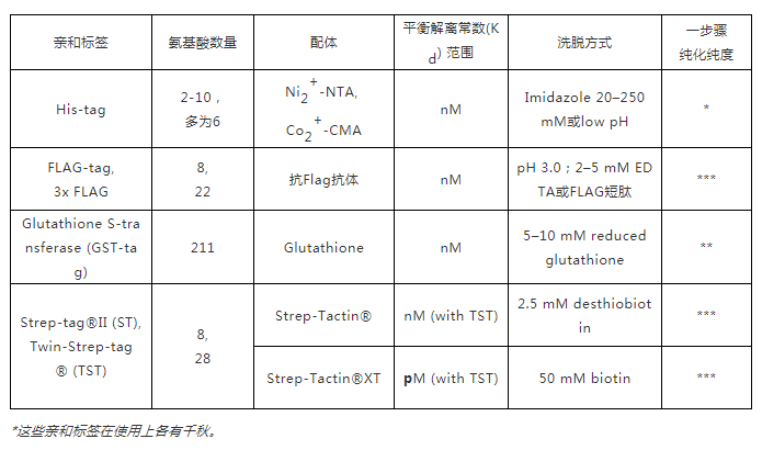 首先,需考慮選擇合適的親和標(biāo)簽。常用于哺乳動(dòng)物表達(dá)系統(tǒng)的親和標(biāo)簽有His-tag、FLAG-tag、GST-tag及Strep-tag?等[4-12],整理于下表:
