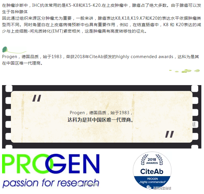 Progen可提供130多種Keratins抗體以及標(biāo)準(zhǔn)品, 抗體包括單抗、多抗,可用于IHC/WB多種應(yīng)用。