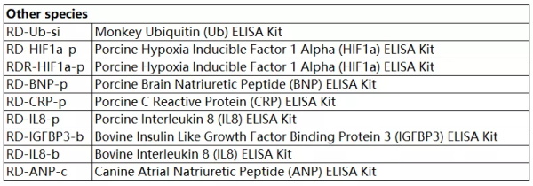 種屬多——人、小鼠、大鼠、雞、牛、豬、狗、山羊、綿羊、馬、豚鼠、斑馬魚、猴、兔等;