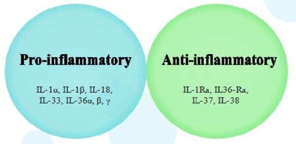 IL-1家族成員是先天免疫和炎癥的中樞介質(zhì),大多數(shù)IL-1家族細(xì)胞因子具有促炎作用(IL-1α,IL-1β,IL-18,IL-33,IL-36α,β,γ),而部分具有抗炎作用(IL-1Ra,IL-36Ra,IL-37,IL-38)