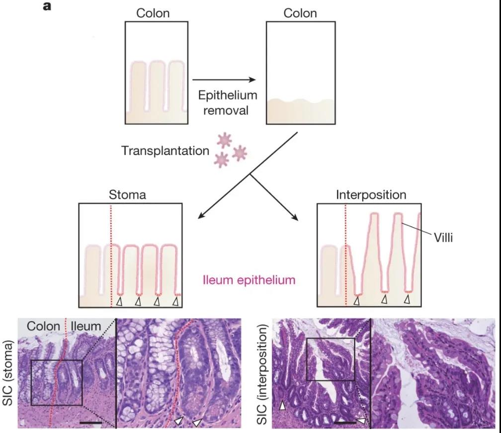 通過上皮置換產(chǎn)生SIC的策略。頂部,結(jié)腸上皮被去除(EDTA處理),然后回腸類器官被移植。在進行介入手術(shù)之前,移植的回腸上皮顯示出隱窩狀結(jié)構(gòu)(左下圖和圖像)。移植后,會形成絨毛狀結(jié)構(gòu)(右下圖和圖像)。白色箭頭表示潘氏細(xì)胞。