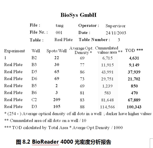 如圖8.2所示,這是BioReader 4000光密度分析報(bào)告。它可以提供的信息有:孔的位置、每孔的斑點(diǎn)數(shù)目、該孔斑點(diǎn)的平均光密度(Average Opt. Density)、該孔斑點(diǎn)的總面積(Cumulated values area)、該孔相對(duì)細(xì)胞因子分泌總量(TOD,即光密度總值)。