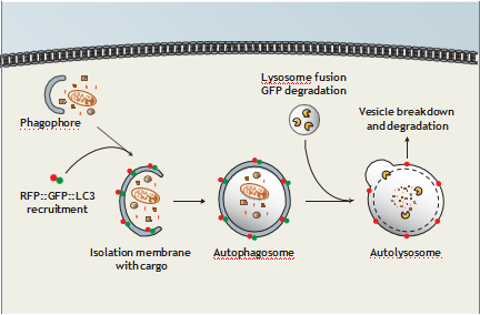 自噬通過溶酶體將胞漿物質(zhì)降解,是維持恒定程序的基本要素。研究自噬潮(autophagicflux)的關(guān)鍵蛋白是LC3(微管相關(guān)蛋白1輕鏈3)。在分離膜形成時胞漿中的LC3被招募并進(jìn)入自噬程序,此定位動作被視為自噬膜的特征,用以檢測自噬的生成和發(fā)展。由LC3B融合一個綠色熒光蛋白(GFP)和一個紅色熒光蛋白(RFP)組成的嵌合蛋白 ,是檢測自噬過程的簡單方法。自噬體的形成可被RFP-GFP-LC3標(biāo)記,顯示RFP和GFP雙信號。與溶酶體融合后,酸性環(huán)境可顯著降低GFP信號,RFP信號卻保持穩(wěn)定。隨著自噬研究熱度的不斷提高,自噬報告基因細(xì)胞作為自噬過程研究的工具越來越多的受到廣大科研工作者的關(guān)注。