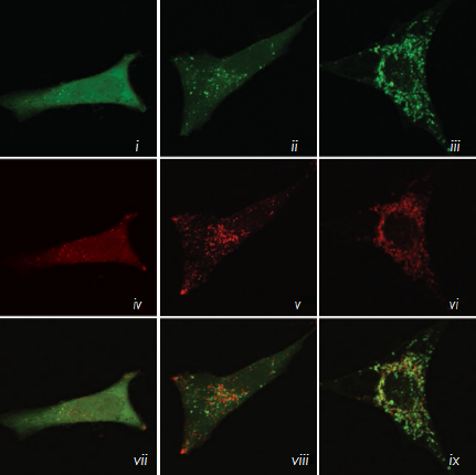 ☆HeLa-Difluo?hLC3細(xì)胞被25μM rapamycin 單獨處理或25μM rapamycin和 500nM bafilomycin A1(抑制自噬體和溶酶體融合)聯(lián)合處理。孵育24小時,用2% PFA固定細(xì)胞,并用共聚焦顯微鏡分析結(jié)果。請注意在圖片viii中,黃色(自噬體)和紅色(自噬溶酶體)斑點均顯著提升,而圖片ix中的斑點幾乎均為黃色(自噬體)。